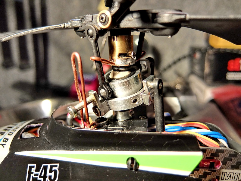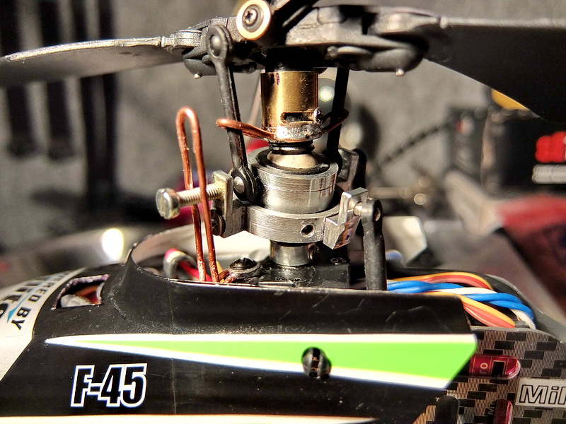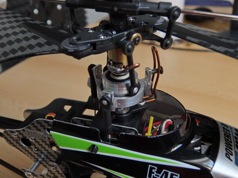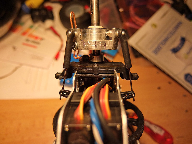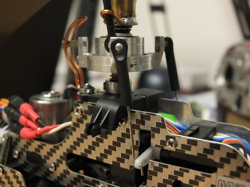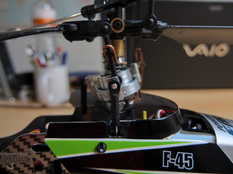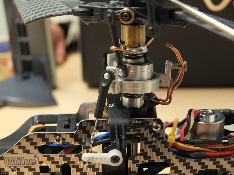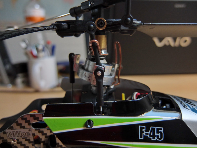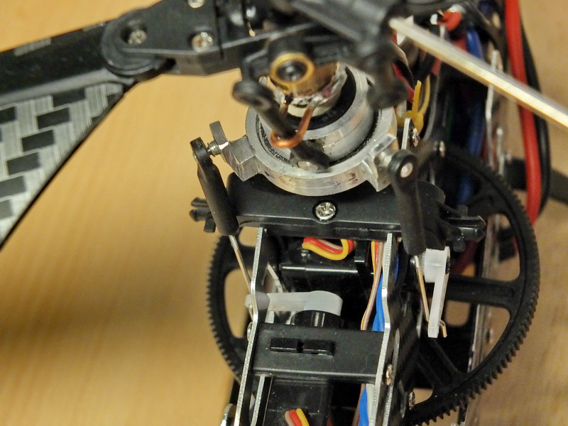 Bylo nutné pootočit unášeč táhel proti smyslu otáčení hlavního rotoru aby se správně načasovalo klopení listů rotoru.