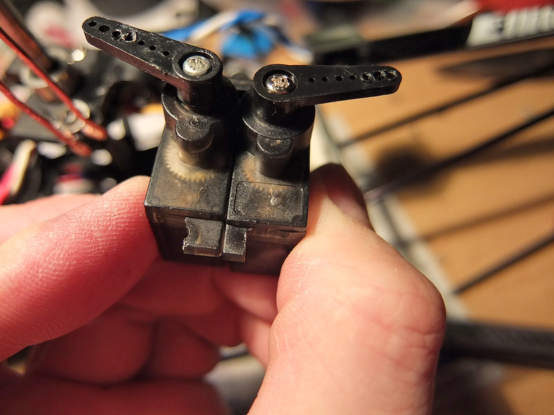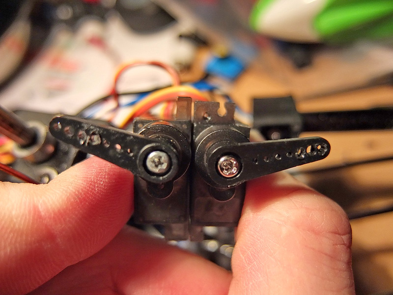 Bočnímu servu se otočí páka o 180°a změní smysl otáčení přepojením konců trimru a přepólováním motorku